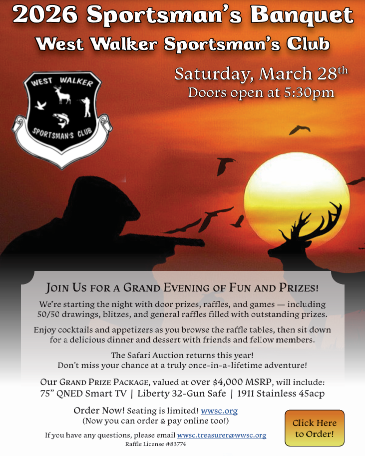 Drawing to be held Saturday, March 28, 2026 at the Sportsman’s Banquet. Need not be present to win.